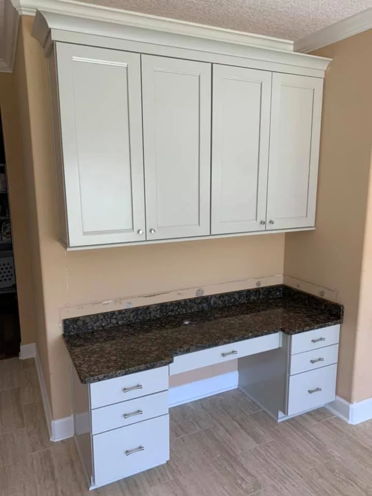 We install cabinets, counters, and backsplashes.